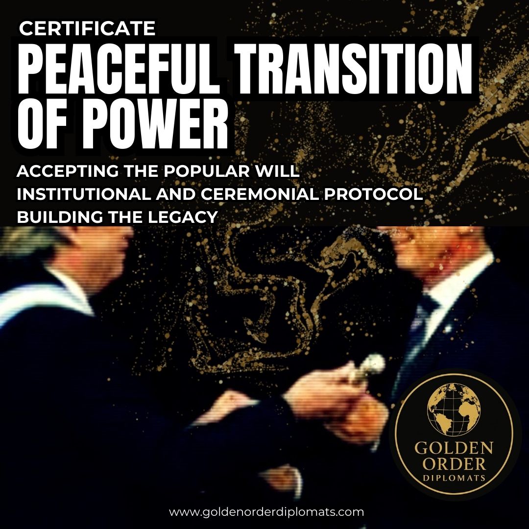 The Certificate: Peaceful Transition of Power is an educational program designed by Golden Order Diplomats to train emerging leaders, diplomats, public officials, and governance professionals in the principles and practices of an orderly, inclusive, and sustainable power transition. In a world marked by political volatilities and global challenges, this certificate promotes institutional stability as a pillar of democracy and human development.